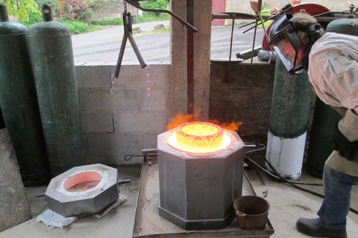 Après étuvage et décirage, nous avons réalisé une fusion de bronze et coulé différents moules.